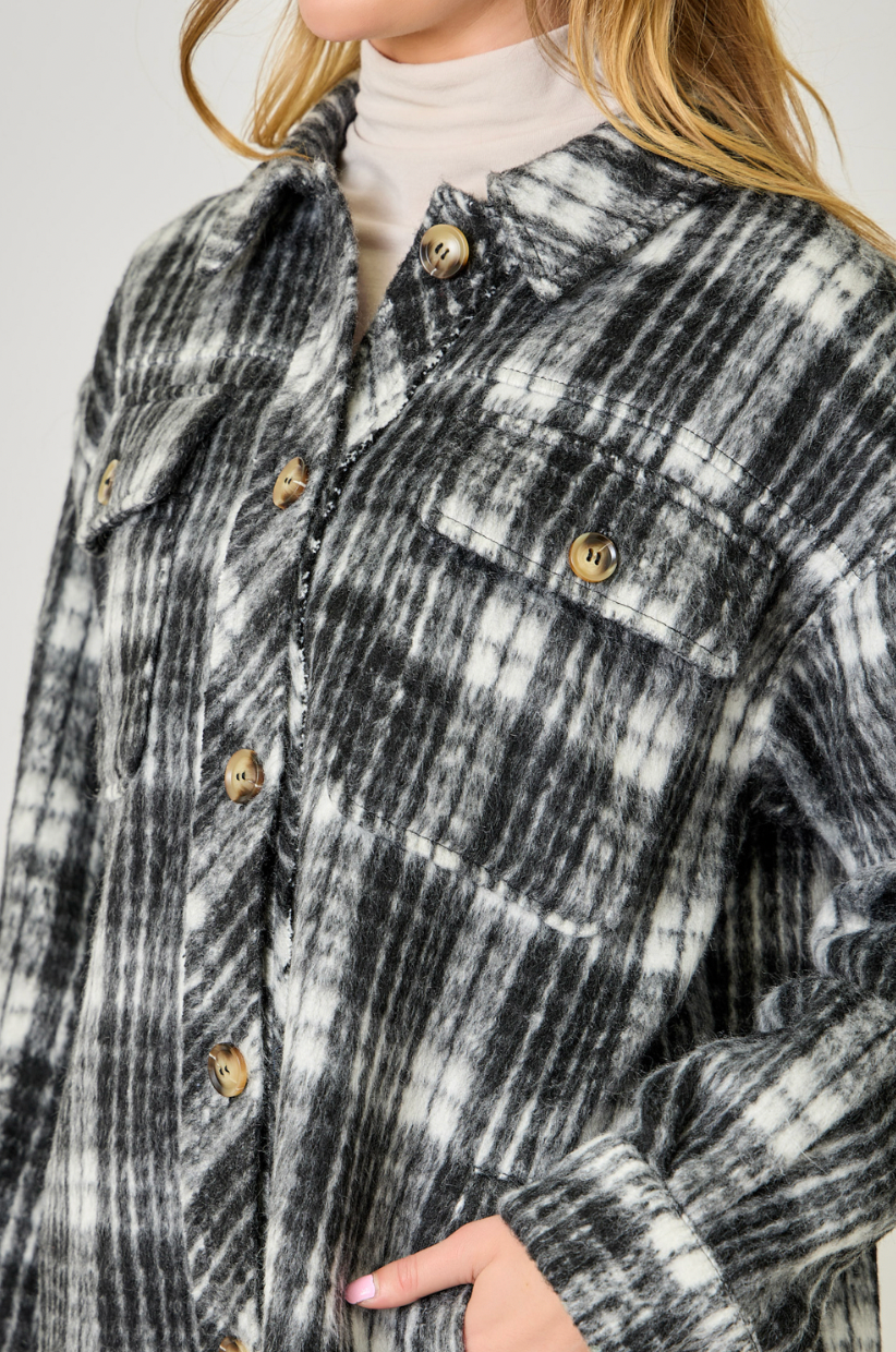 Make a cozy statement with our Fringe Placket Plaid Long Jacket. Featuring a button-down front, chest and side pockets, and a chic hi-lo hem, this jacket brings a playful twist to classic plaid. The knee-length cut and soft, textured fabric make it perfect for layering all season long.