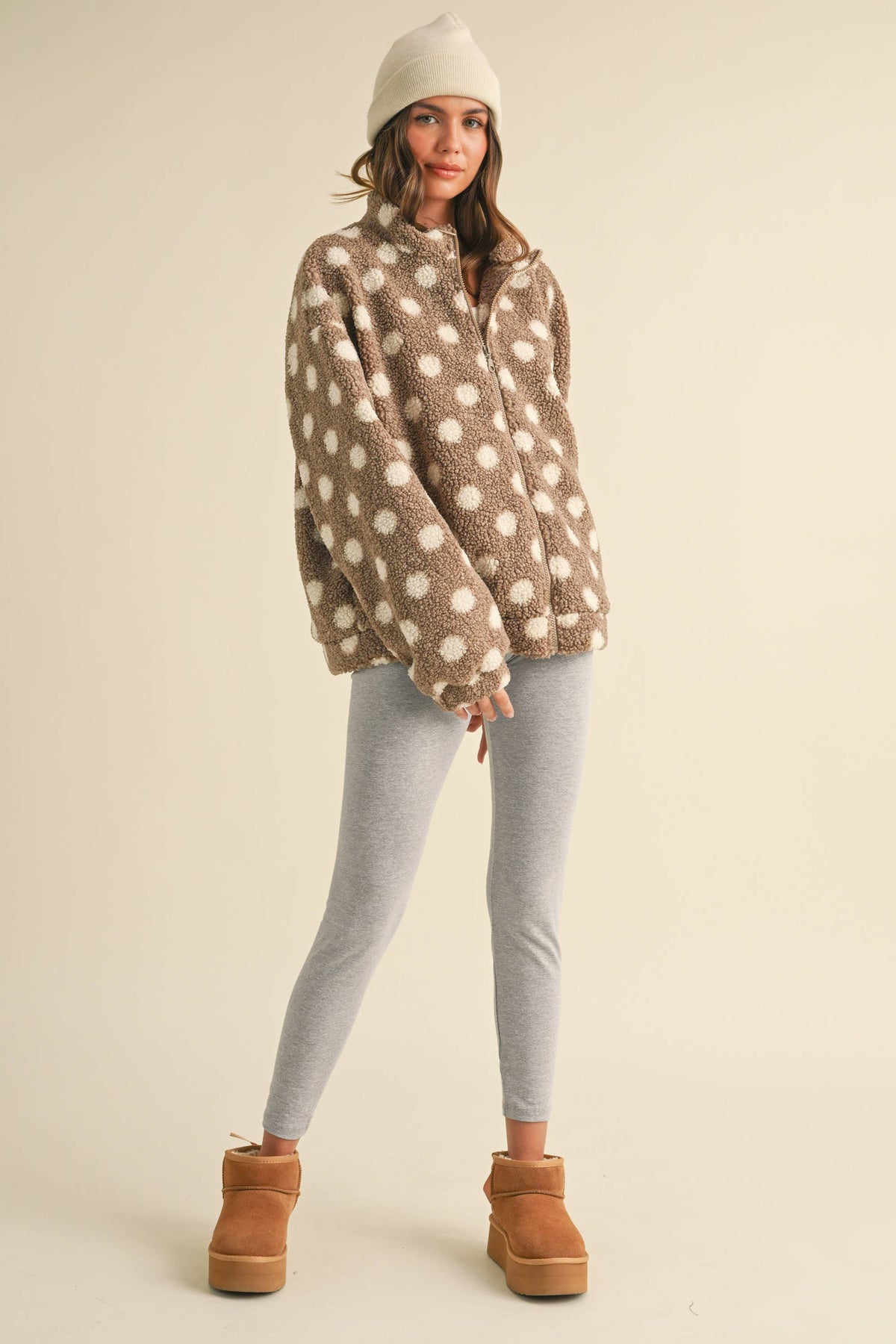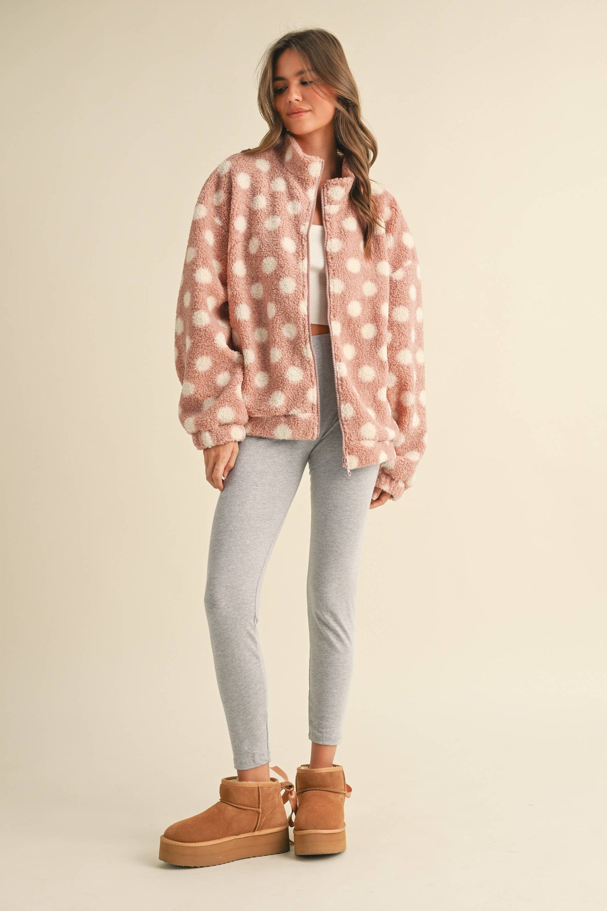 POLKA DOT OVERSIZED TEDDY BEAR ZIPPER FRONT JACKET -SIDE POCKETS