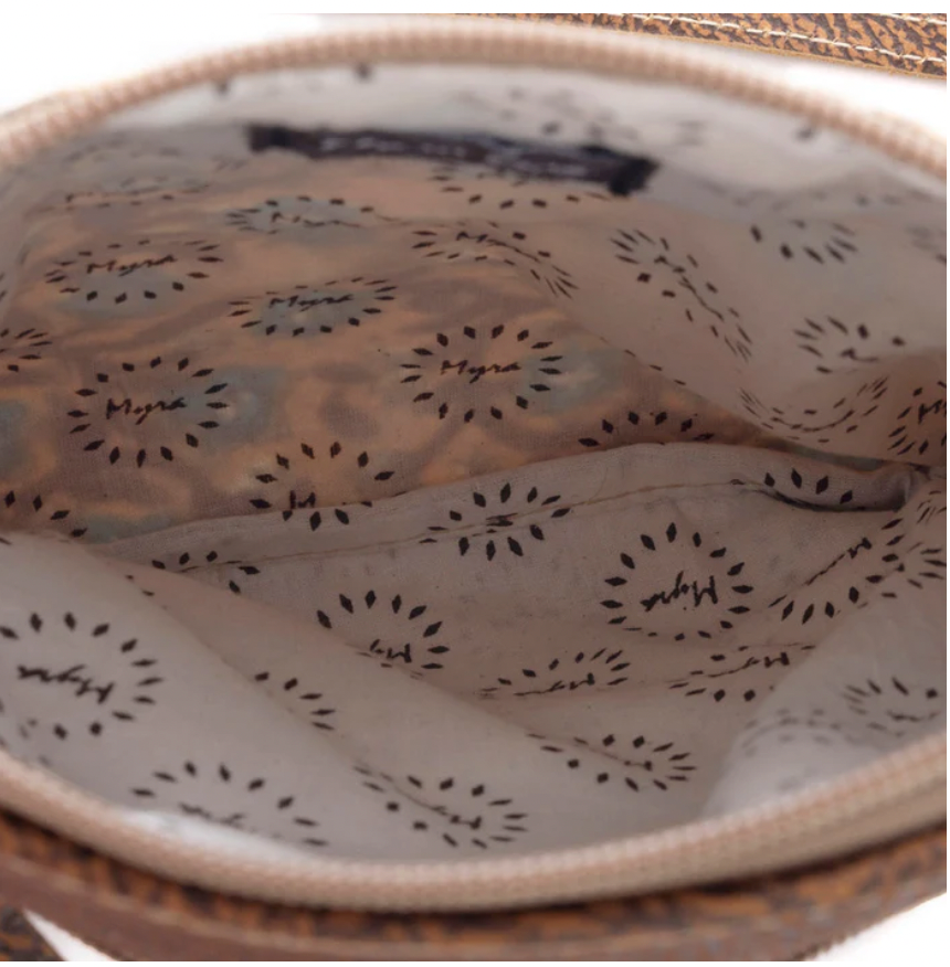 Charming and refined, this lovely bag showcases a floral pattern in soothing shades of blue, mocha, ivory, and chocolate. The serene foliage design is framed by rich patterned leather, artfully stitched to perfection. Compact yet spacious enough for your essentials, it’s the perfect balance of style and function. Features a zippered top closure and a detachable, adjustable leather shoulder strap. You’re sure to fall in love with this timeless piece.