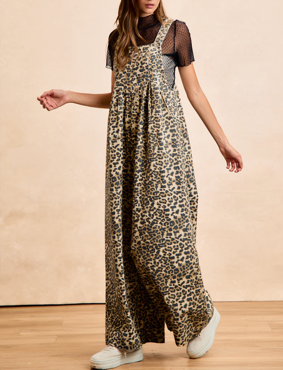 Add a little roar to your outfit with these wide-leg leopard print overalls! Made from soft cotton twill, they’re relaxed, roomy, and perfect for layering over tees or light tops.