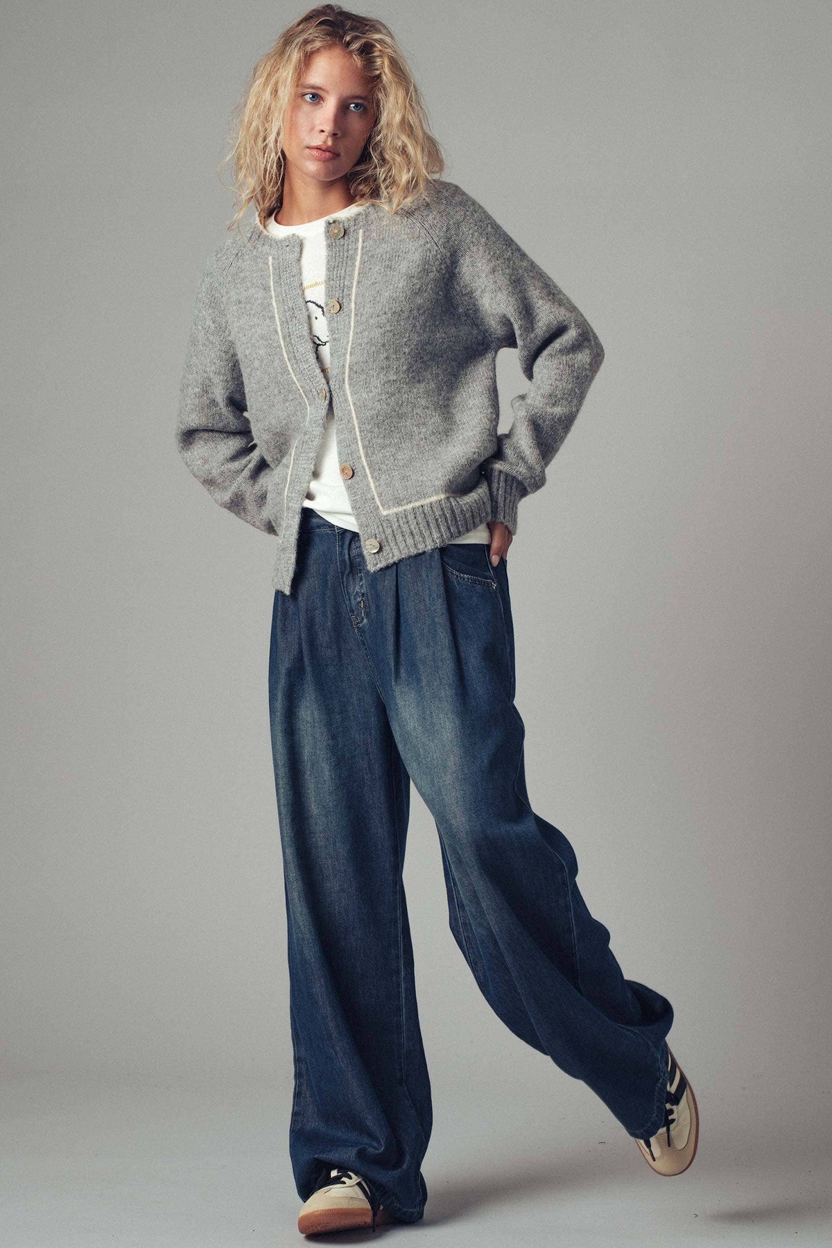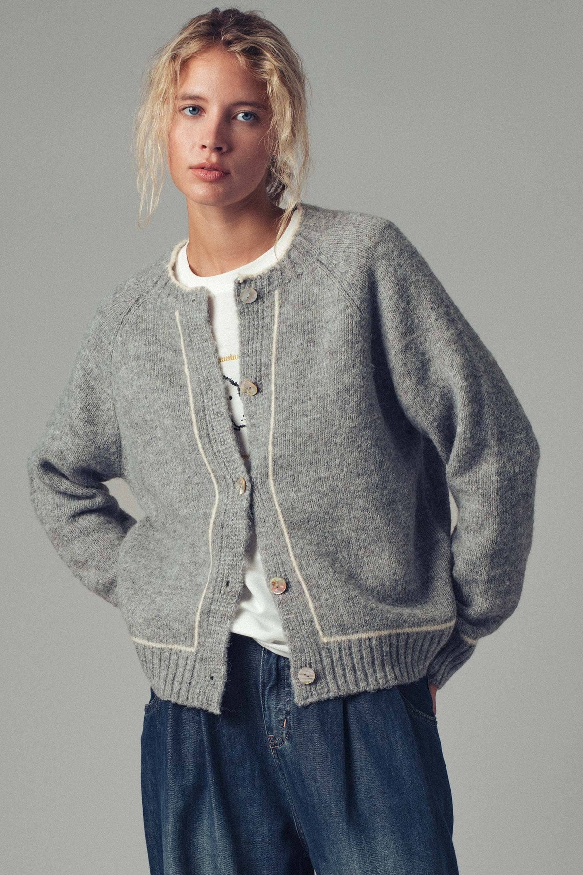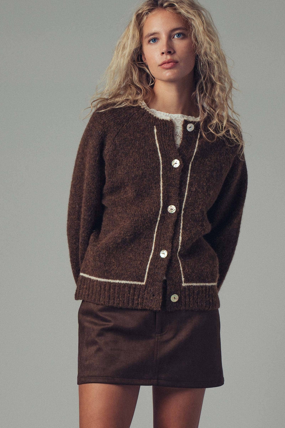 This cozy boho-inspired knit cardigan features a relaxed silhouette with dropped shoulders, contrast trim detailing, and a soft, plush texture. A versatile layering piece for cooler seasons, perfect for pairing with skirts or denim. Features: • SM-ML:3-3 • Contrast white trim details • Button-down front closure • Soft, cozy knit texture • Made in China The sweater measures approximately 20.5" bust, 23.5" length, and 27.5" sleeve (measured from size Small) Fit: Relaxed silhouette with dropped shoulders